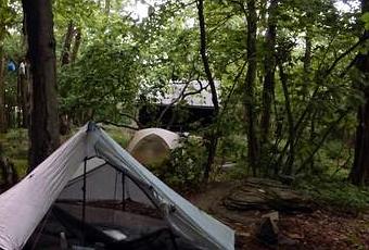 Something tells me the animals in the park are just accustomed to hikers which may not be a good thing as they don't run away and seem to know we have food. I got to the shelter and camping by 5:45pm and two other solo thrus were there that were very chill and quiet. It seemed that they had been there awhile and were ready to turn in soon after I got there. By 7pm, it got darker and thunder got louder. I quickly finished dinner and hung my food on the provided bear hang just before the rain started. I got a camp picture just before it rained too.