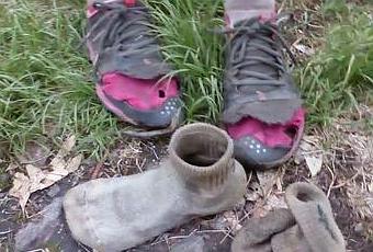 One more photo is of Robin Hood's socks which are so dirty from the rain/mud earlier this leg that they stand up on their own. Also, Momma Bear has been wearing the same shoes all hike and they are completely destroyed. She should have a new pair in town in two days. They are even worn through on the bottom in some places. She said she doesn't like to spend money on things unless she really needs them. She's also wearing the same Super Feet Shoe inserts she wore on her AT hike 12yrs ago! She's got some really tough feet! New ones should be in town waiting for her.
