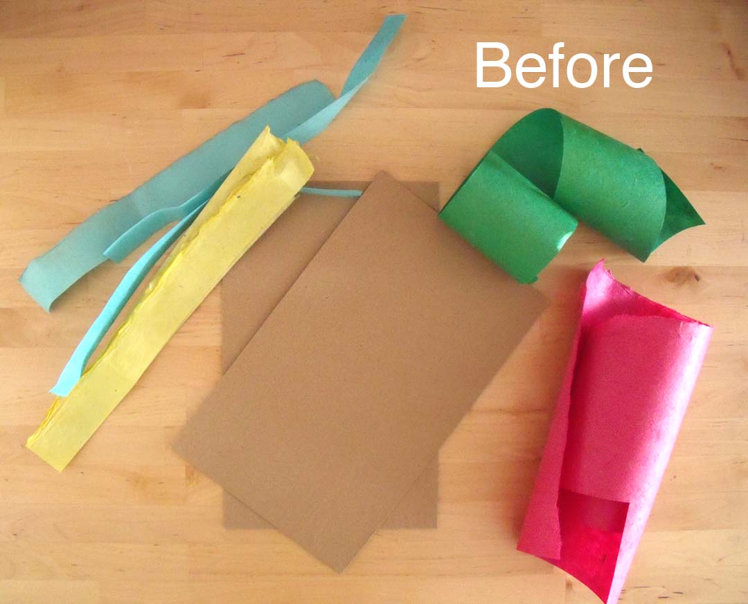 Materials:-paper or fabric scraps-recycled cardboard-recycled newsprint-string-button (optional)