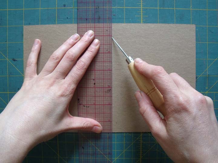 Step 3: Flip over and use the awl to make holes in the center of the spine 1/2" apart.