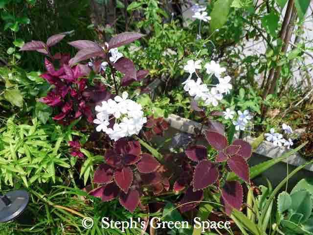 On the bright side, my dazzling white Plumbago flowers were looking quite attractive against the dark foliage of Coleus and Althernanthera dentata 'Purple Knight'. I couldn't resist taking a picture or two of the flowers.
