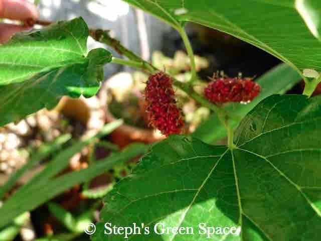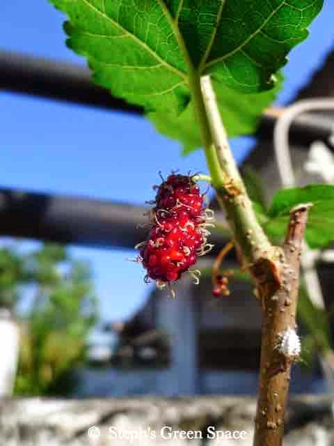 It is easy to grow a Mulberry but the plant attracts mealybugs! Can you see one in pic below... yikes! But good thing they don't eat up the fruit ;-)