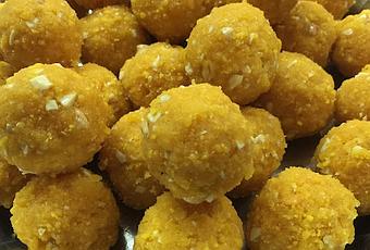 Laddu (laddoo) is a spherical sweet made from flour, ghee and sugar. For attraction and taste, cashew nuts and dried raisins are added. Laddus are served during festivals, marriages and religious occasions !! and . .. .. ___