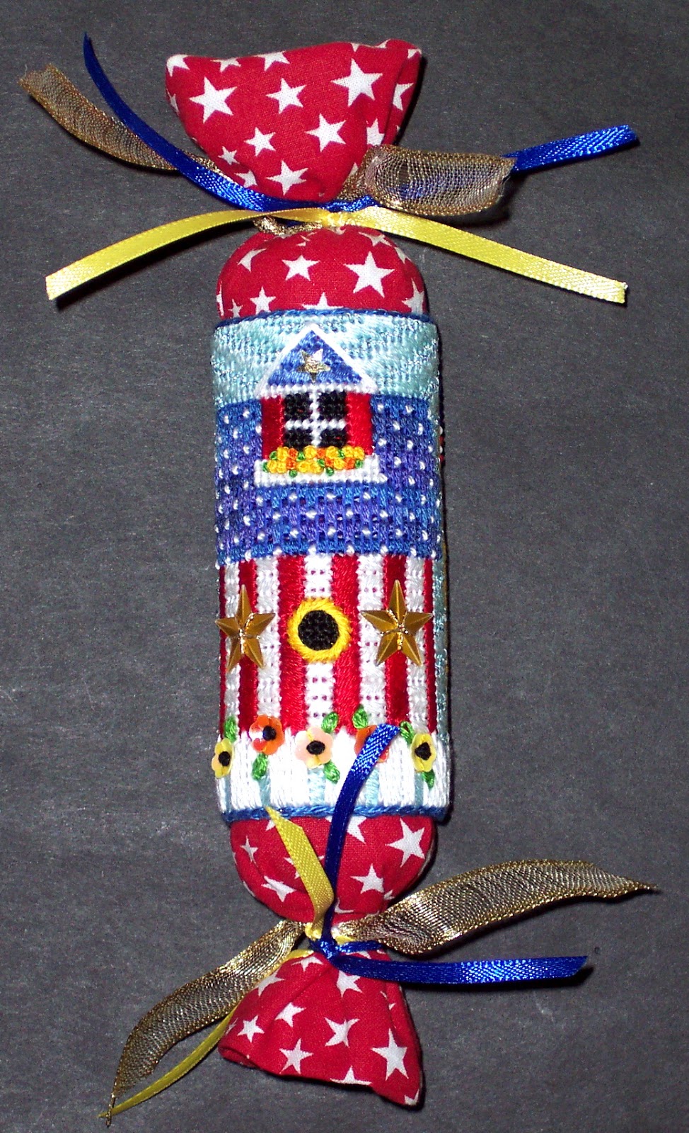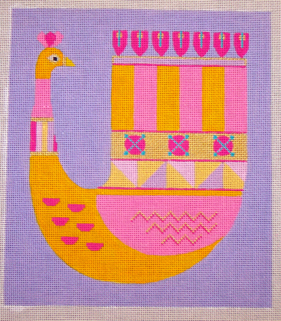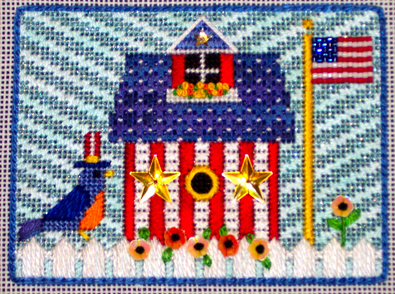 Birdcage Heart is a painted canvas with stitch guide, the photo really does not convey just how sparkly it really is!