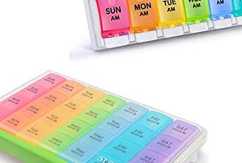 The weekly meds organizer includes 7 colorful cases, with each compartment holding up to 8 large fish oils or 12 standard-sized multivitamins.