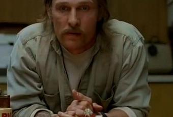 1. Rust Cohle – True Detective He came into my life and left. 8 hours only. I miss his nihilistic quips under his breath. I miss the existential ponderings as he cut up aluminum beer cans and made little people, as if he himself were God and we just the figurines he played with. I miss him blowing smoke in my face and his swagger with a beer in his hand. Of course, his true bromance was with Marty (Woody Harrelson), and the two needed each other more than either may admit to.