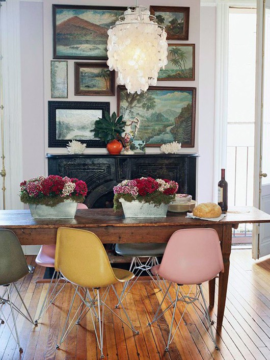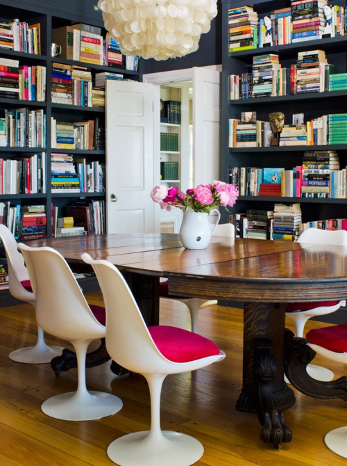 The Saarinen tulip chairs above are a delightful addition to this library / dining room. I love the idea of a dining room being more than just a dining room. Books lining the walls make for a very interesting and ever-changing art installation, don't you think?