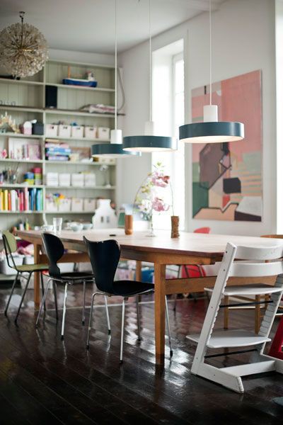I love this image because it reminds me of my own table, especially because of the Stokke Tripp Trapp at the end. We bought one of these for our first child with the intention of getting another when our second child came along but unfortunately the cost of a second... we just never got around to spending the money. It's a shame really because I like the idea of the girls' being able to use their Tripp Trapp at their desk as they grow older. I love that they fit under the table just like any other chair, I hated the idea of some horrible monstrosity of a high-chair and the Tripp-Trapp is the perfect designer high chair!