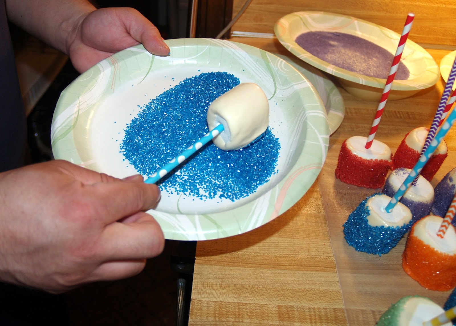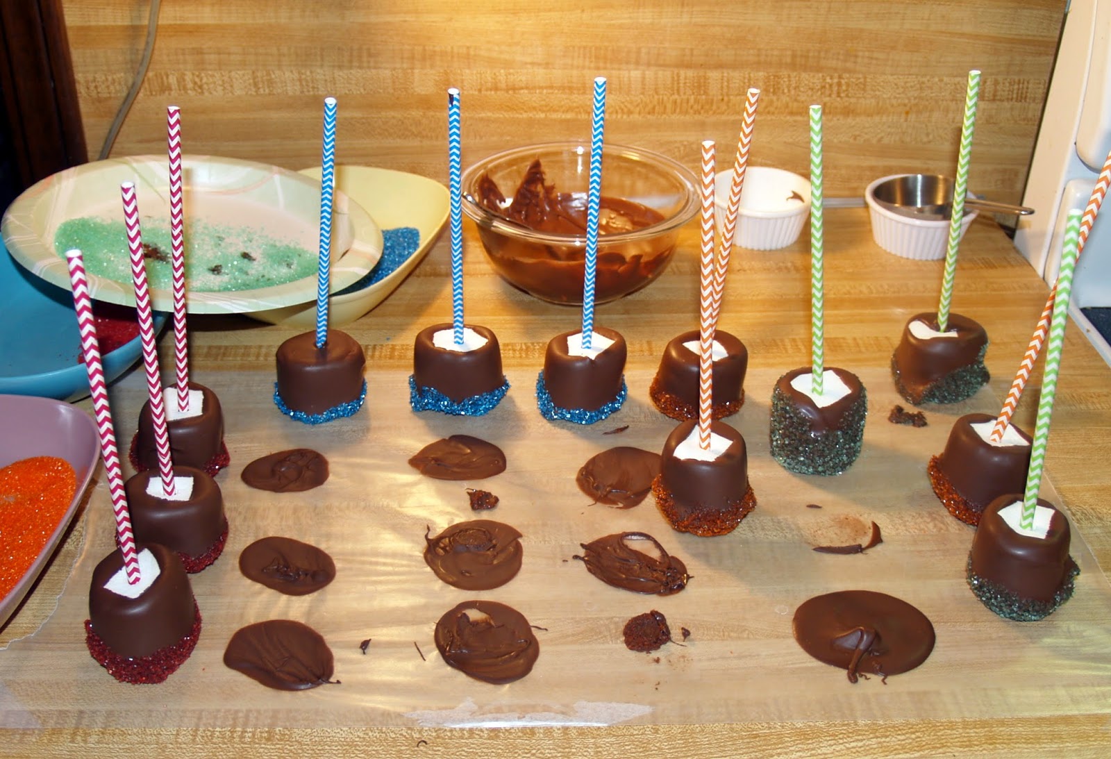 I think both the chocolate and the white dipped marshmallow pops tasted good. I prefer the look of the white ones covered in the colored sugar. I didn’t waste any, though. If they looked decent they went on the platter for the birthday party.The good directions to make Dipped Marshmallow Pops