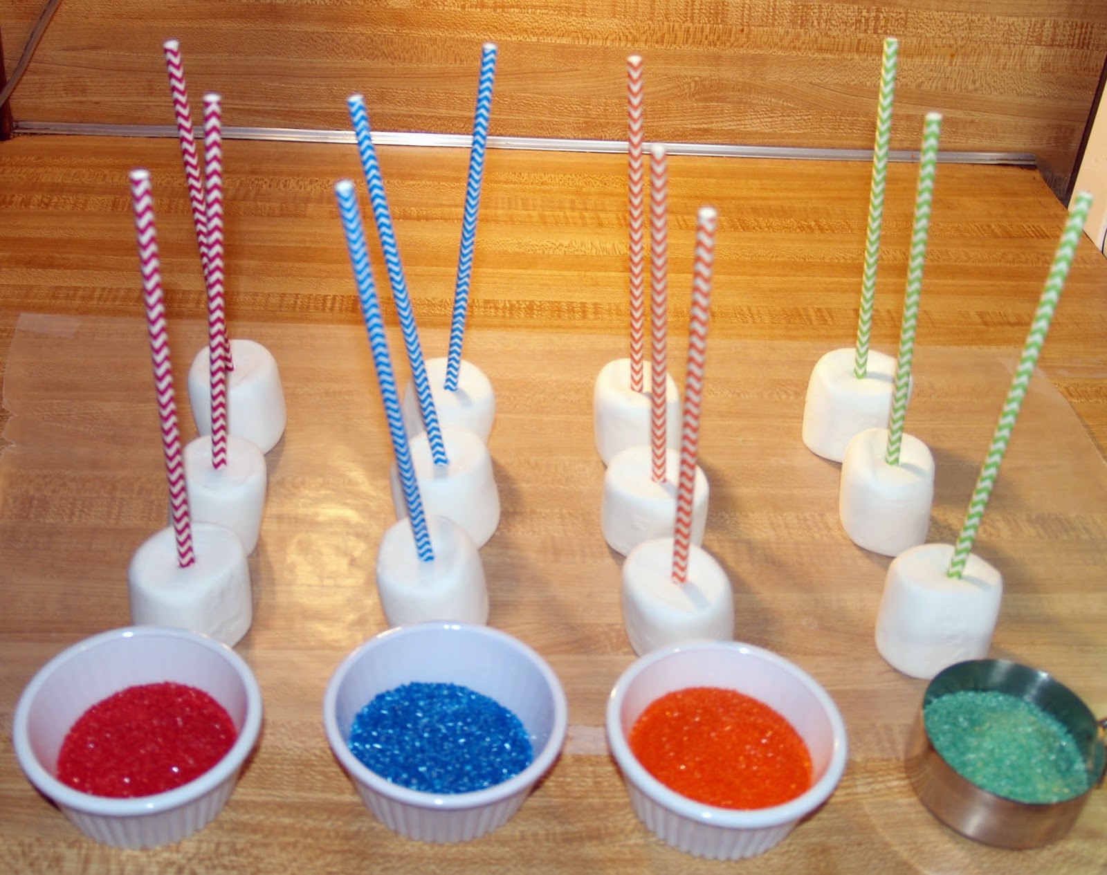 Stick the decorative straws in one end of the Jumbo marshmallows. I had to reshape some of the marshmallows to be more round with my hand. I wasn’t really going for perfect and that’s probably a good thing.