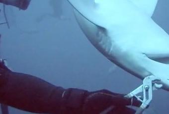 A pair of amateur conservationists film themselves removing a fishing hook from a shark’s mouth off the coast of Jupiter, Florida