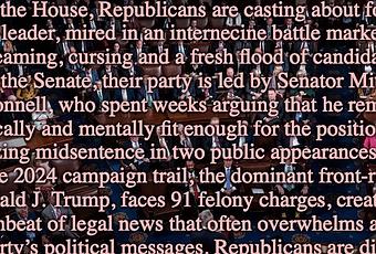In the House, Republicans are casting about for a new leader, mired in an internecine battle marked by screaming, cursing and a fresh flood of candidates. In the Senate, their party is led by Senator Mitch McConnell, who spent weeks arguing that he remained physically and mentally fit enough for the position after freezing midsentence in two public appearances. And on the 2024 campaign trail, the dominant front-runner, Donald J. Trump, faces 91 felony charges across four cases, creating a drumbeat of legal news that often overwhelms any of his party’s political messages.