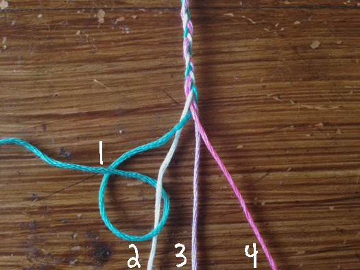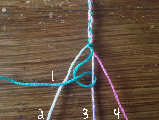 Now you have completed one row. Start the process again using strand 2 as your dominant strand. Double right hand knot your way through strands 3,4, and 1.