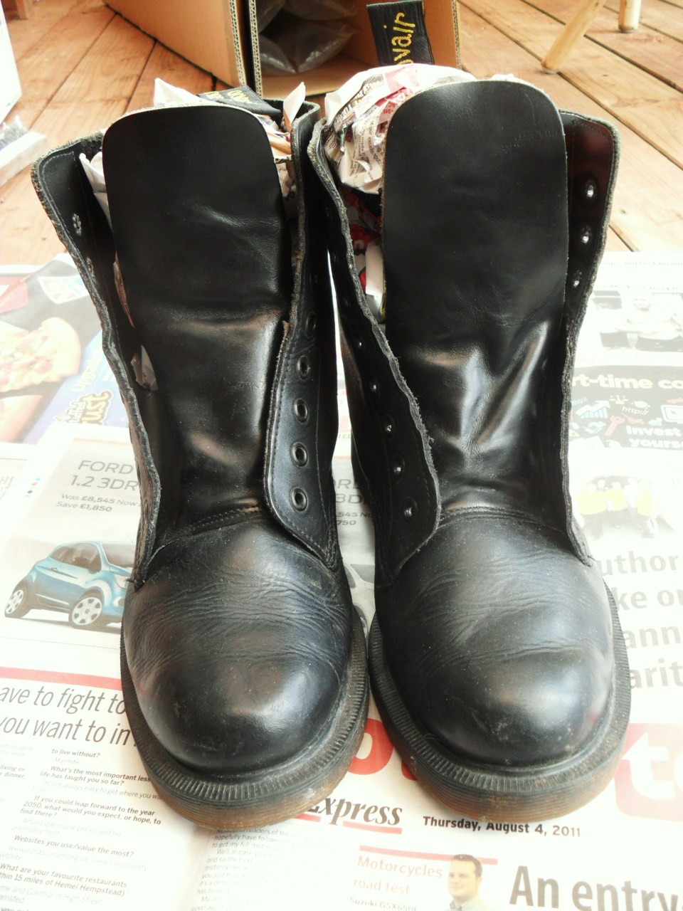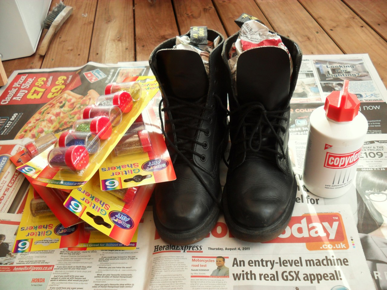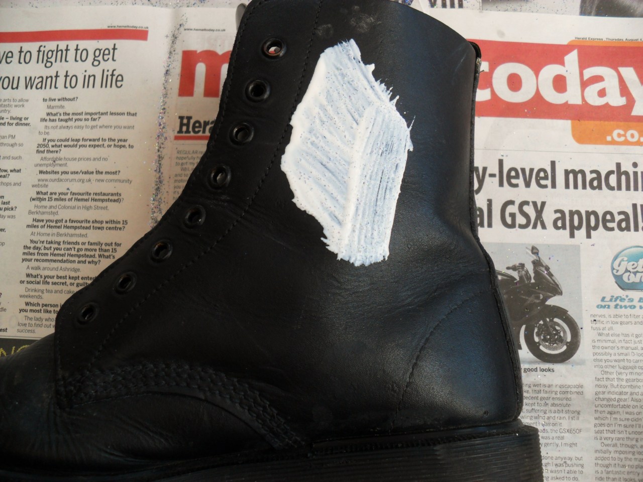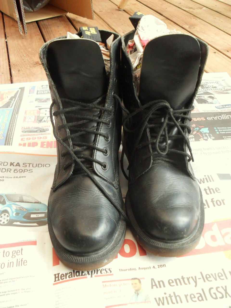 So the boots will start out something like this (just plain black doc martens). fill them with newspaper so it is easy to handle and the boot keeps it’s shape.