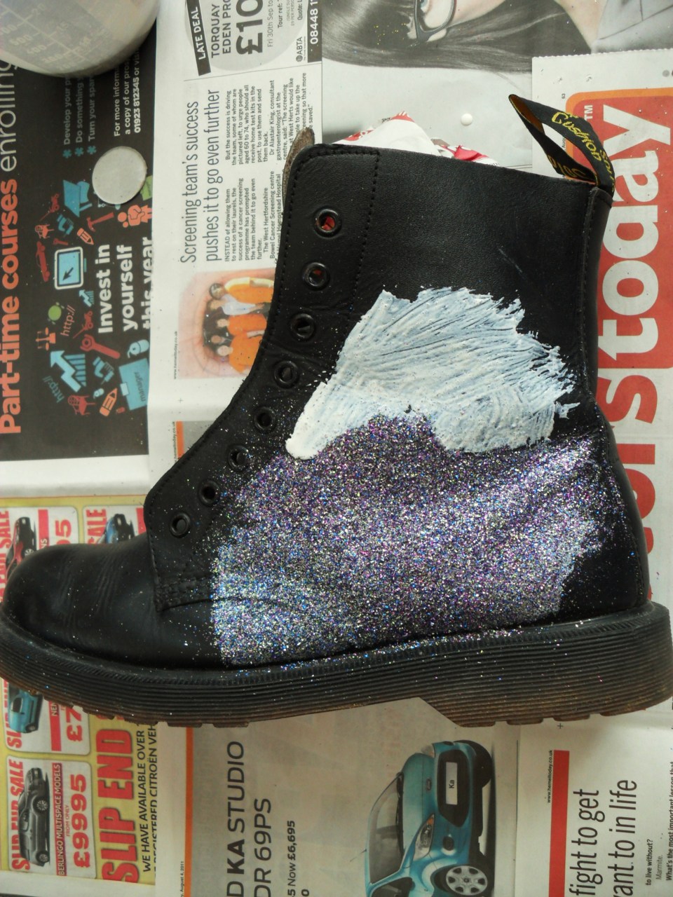 Take the laces out of the boots so it is easier to apply the glue and glitter and you get an even coverage