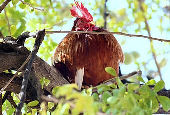A photo of a big fat hen sitting up above on a tree