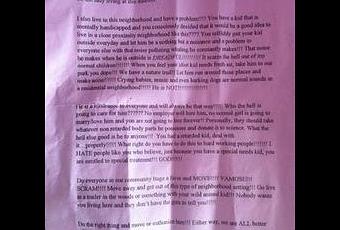From its tone, the letter might be considered anything from abusive to threatening or perhaps even criminal. It is addressed to "the lady living at this address" and signed, "One pissed off mother!!!!*"