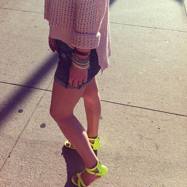 Sweater: Elly's Couture. Shorts: 7 for all Mankind. Bralett: Hanky Panky. Shoes: Rebecca Minkoff. Gold Link Necklace: By Malene Birger. Jewelry: J.Crew, Lily and Laura, Liz Fohr, Sweet Ties, Alex Monroe, Nordstrom. Lipstick: Nars Jungle Red.