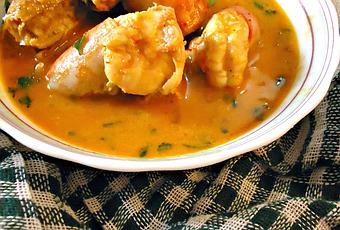 In the meanwhile heat oil in a skillet and fry the onions golden brown. Add the lobsters taking them out of the marinade and sauté for a minute until they turn reddish. Now add the remaining marinade. Continue to stir. Add the strained methi/fenugreek soaked water.