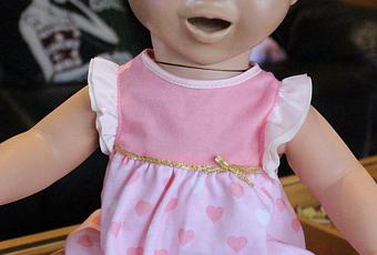 Luvabella says over 100 words and phrases. When you first take her out of the box, Luvabella babbles, laughs and cries. As you play with her, she learns more unique words and phrases, like “spooky” or “food, please.” Luvabella also loves to play games. If you hold your hands over her round, blinking eyes, she’ll start to mumble and eventually shout “peek-a-boo”! It’s actually quite adorable!