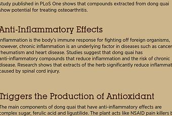 Inflammation is the body’s immune response for fighting off foreign organisms; however, chronic inflammation is an underlying factor in diseases such as cancer, rheumatism and heart disease. Studies suggest that dong quai has anti-inflammatory compounds that reduce inflammation and the risk of chronic disease. Research shows that extracts of the herb significantly reduce inflammation caused by spinal cord injury (x).