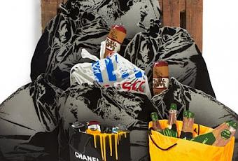 A show of beautifully hand crafted stencil works that discover the beauty amongst our trash. Photo real renditions of humble bin bags & high class labels painted on a decade’s worth of bin and skip raiding. Up-cycled objects, grannies cushions, nothing avoids the Dotmasters' magpie eye. Mixed media assemblages pop off the wall in a faux 3D skid row tableaux. The frames are off, and work spills from the walls like the piles of trash they depict.