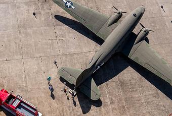An overhead view of the Pearl Harbor Aviation Museum’s C-47A “Cheeky Charlie”. Delivered in 1943, this aircraft had a distinguished service record in the Pacific. Postwar, it was converted to DC-3A airliner configuration and operated in Australia. In 1970 it was converted again to a freight transport, then transferred to Hawaii in 1972 where she was utilized for inter-island freight operations. The C-47 was flown by Aloha Airlines on its 40th anniversary in April 1998, eventually joining the Museum collection in 2012. It’s service life exceeded 55,000 flight hours. First flown in 1941, more than 10,000 of these iconic transports were produced. Approximately 100 countries’ armed forces have operated the C-47 with over 60 variants of the aircraft produced. As with the civilian DC-3, the C-47 remains in service in the present day with some nations. In June 1975 the USAF retired their last C-47 in service.