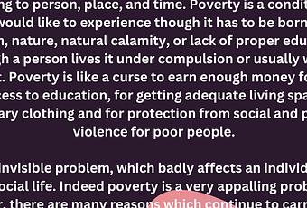 Poverty is similar to the condition of a slave who is unable to do anything he wants. It has many faces which keep changing according to person, place, and time. Poverty is a condition that no one would like to experience though it has to be borne due to custom, nature, natural calamity, or lack of proper education. Although a person lives it under compulsion or usually wants to avoid it. Poverty is like a curse to earn enough money for food, access to education, for getting adequate living space, necessary clothing and for protection from social and political violence for poor people.