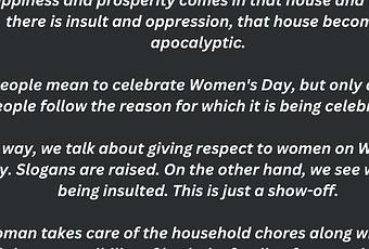 - In a way, we talk about giving respect to women on Women's Day. Slogans are raised. On the other hand, we see women being insulted. This is just a show-off.