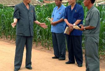 DPRK Premier Pak Pong Ju (L) talks with agricultural officials during a tour of farms in North P’yo’ngan Province (Photo: Rodong Sinmun).