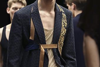 The inspiration for Dries van Noten's Spring / Summer 2015 collection was inspired by John Everett Millais' Ophelia and William Shakespeare's A Midsummer Night's Dream. The Ophelia was the Pre-Raphaelite image that launched a million hippie fantasise with Ophelia that floats dreamily in a magical woodland setting. This mood was recreated by Dries Van Noten with dusky golden lighting and a mossy forest carpet on the floor. The gossamer lightness and gilded fabrics loaned a fairy tale element, colours were deep and muted, as if illuminated by sunlight filtered through trees.