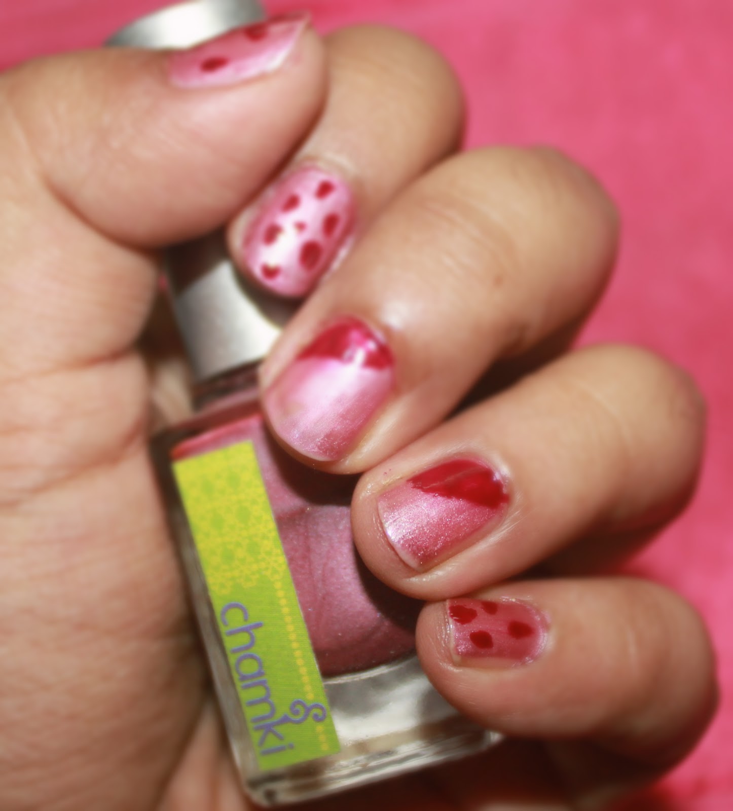 I like the fascinatingand quirky Indian name of this nail polish. This is in dual metallic pink and onion pinkshade. You can get this double shade nail polish for Rs.110. This gives awesome metallic finishthat tends to fade after 3-4 days. You will need minimum 3 coats to get the color. The brush helps in smooth application and the suit will all Indian skin tone.Nail art for Chamki Nail Polish -Kamal