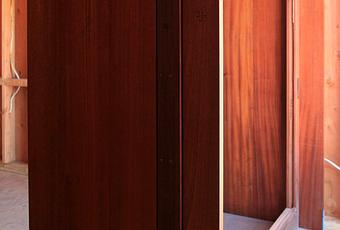A pre-assembled mahogany lift and slide door from ArchiSpec. This sliding door is shown in a guest bedroom waiting for installation.