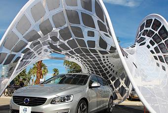 The “Pure Tension Pavilion” made its U.S. debut this weekend as part of Dwell and Volvo’s activation at the Modern Living Expo and Prefab Showcase. Designed by Alvin Huang, this a free-standing tensioned membrane structure is a rapidly deployable and portable solar charging station designed to power up the Volvo V60 Plug-in Hybrid, the world’s first Diesel Plug-in Hybrid.