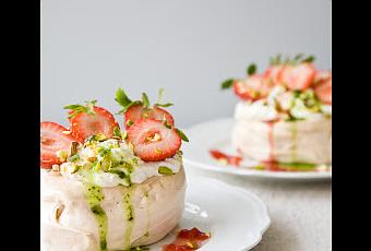 pavlovas with strawberries, vanilla cream, + basil coulis by tartine and apron strings