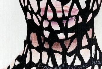The Mask of Fashion is a work specifically created by American prison artist C-Note in 2024, for the 26th Annual “Works on Paper,” a national juried competition and exhibition at the Long Beach Island Foundation of the Arts & Sciences, Long Beach Island, New Jersey, May 18 – July 18, 2024. The work is Collage and wax on paper. The collage being black canvas glued on top of a wax portrait drawing of a woman, also known as Untitled Woman with Green Eyes.