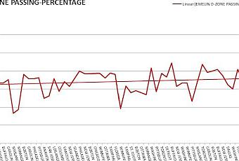 The second-half of the season saw him produce defensive-zone passing-percentages above 80% 10 times, including one game where he was successful with 94% of his d-zone passes, and another where he was successful with all 7 of his defensive-zone pass-attempts. Also, his d-zone passing-percentage fell below 60% only 5 times during the second-half.
