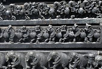 Exquisitely carved on stone – Horse riders, Lions & Elephants – at Halabedu