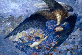 Dark hair and dress, Night flutters through the sky, shushing a baby who scatters poppies into the air, which turn into a flight of golden birds. All is movement, travel, but on silent wings, and cherubs cling to the folds of her dress. I can't quite work out her wings, it is as if another figure of equal size to her travels behind her, just out of our sight.