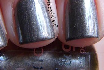 Date with the Night is a brown metallic polish. Really brush-stroke-y. It took me 2 careful coats with a light touch to kind of even it out. I'm not sure why I grabbed this from the shelves. I am not a fan of metallic or frost finishes at all. I guess I was drawn to the dark brown in the bottle. Unfortunately, it didn't really translate on the nails. It's more gray on me for some reason :|
