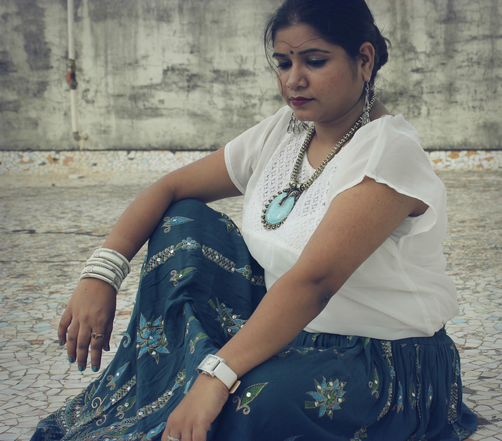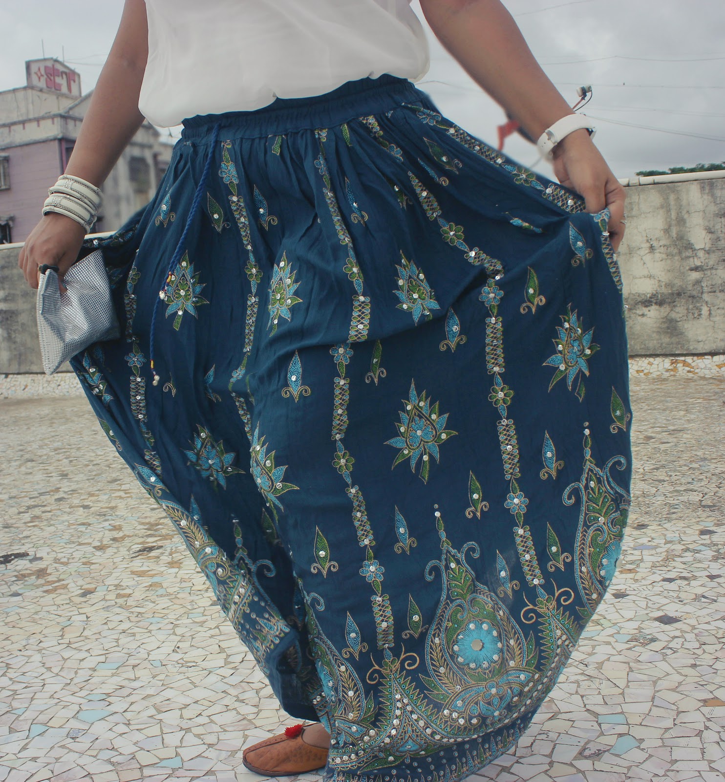I wore Teal Embellished Flared Skirt with sheer white top(both bought from JABONG – online shopping portal). This is quite comfort clothing for me especially while attending any special event during summer. The light ethnic cotton skirt and the lace top match so well with each other to give that awesome elegant look.
