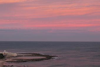 Nice way to end a working week spent up here in Newcastle. Here's a shot Pammy took a few minutes ago, around sunset. It's been one of those cloudy days where it never rained, but always looked like it was going to. We're looking out to the east here, and all those moisture-filled clouds which are drifting so far from shore are glowing pinky-red.