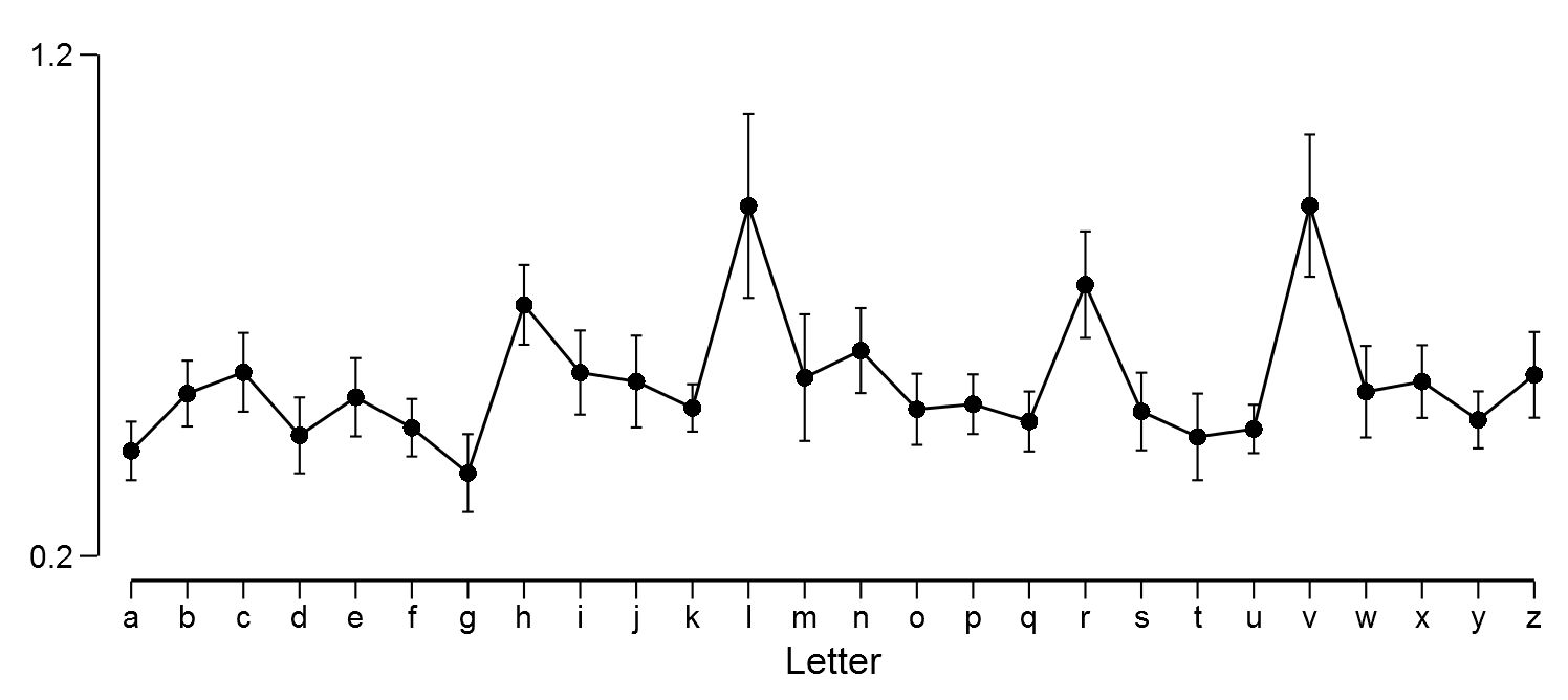 I like to analyze variability directly too, so for each participant and for each letter I computed the standard deviation across the 10 repetitions and ANOVA'd them across letters. There was a main effect (F(25,450) = 9.915, p<.001).Figure 2. Average standard deviation of SNR/nbLog