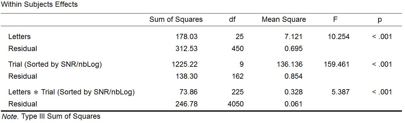 Analysis 1: Letter (26) x Trial (10) within-subjects ANOVA, DV=SNR/nbLog