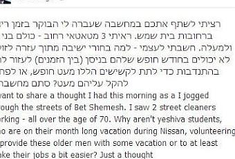 I am very happy to see that a serious discussion about this idea has emerged, even if you disagree. Regarding those who asked about MK's doing this during the long Knesset recess, I can only speak for myself - I am at work every day even during the recess and I have begun exploring ways to volunteer even when not on recess. To those who were concerned about these seniors losing money, I would never consider anything which would mean less pay for them. To those who thought I was attacking Haredim, I did not think for a second about just Haredim and was thinking about yeshiva boys from all backgrounds. To those who asked why yeshiva boys and not others, I feel that all yeshiva boys should be doing chesed in an official manner and vacation time is a perfect time for that. To those who asked why I did not stop to help, I actually did but did not think it was right to include that in the post. Finally, I was not criticizing anyone at all but sharing a thought and idea I had to elicit feedback and I have learned a lot from the feedback.I think this is a non-issue. Nobody is volunteering to do other people's jobs, and the street cleaners would probably be more worried that they are about to be replaced than appreciative for a break if someone came along and told them to take a few weeks off. This is not a solution to anything. If yeshiva bochurim, or anybody else, want to volunteer, or if the government wants to push them to, there is no shortage of wonderful chessed organizations in which they can volunteer, whether it is medical-related organizations, whether it is charitable (help the needy) organizations, or assistance with the elderly or a myriad of others in which each person could find his appropriate place. Suggesting they randomly go over to someone and offer to do their job for them is just silly and is a distraction from real issues and solutions.