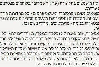 Haredim remove women from advertisements and ad publications - and every news program opens with that story, with all sorts of people explaining why it is good or not good, using terms like 'primitive', 'excluding women', etc.