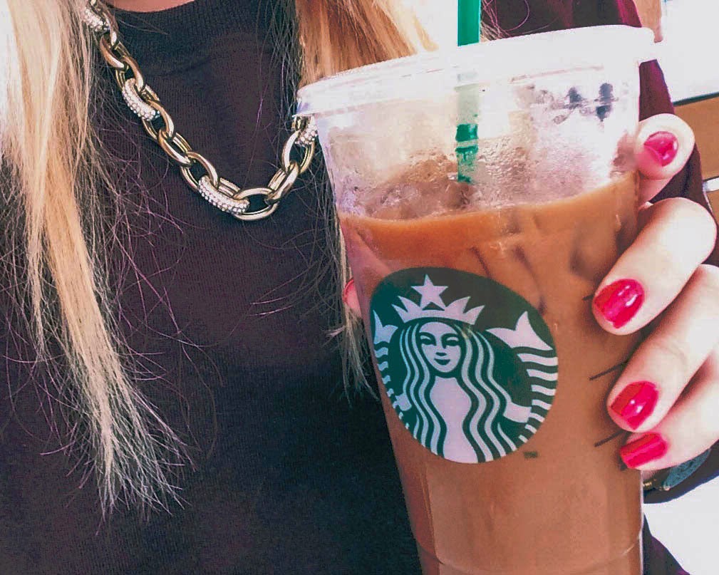 This outfit is one of my favorites yet with the sweater/oxford style combination of the top paired with a gold chain necklace, and booties. I still refuse to wear riding boots until I'm assured that the season has actually switched over. Yes, it can be too soon for them. It's almost like not wearing white until after Easter; you simply must wait.By adding a fun red lippy color into the look, I honestly felt like I could take on the world! And of course with my Starbucks in hand I was ready to conquer anything (see below.)