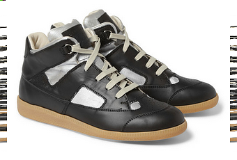 Maison Martin Margiela Painted Panelled Leather High TopsThe shape has become, uniquely enough, a Margiela signature. The very covetable solid gum sole, the smooth rounded leather toe and the streamlined shape of Margiela's Painted Leather High Tops are classic Margiela. The somewhat DIY painted silver panels give that Margiela whimsy while remaining anchored in a solid high top form and that patented numbered label. A great sneaker to grab for you new Margiela enthusiasts that have a nice simple design that'll go from season to season. Available now at Mr. Porter.