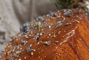 Brush a coat of honey glaze on the top of the cake. Sprinkle with powdered sugar and lavender.