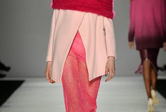 This collection was inspired by the contrast between "strong, pretty and hard and soft". That also happens to be exactly on point with how I like to dress, and accessorize, so its no wonder this collection really screamed out to me. I'll also admit, despite being an activist against the color pink, I really enjoyed the use of the different shades, and textures of pink layered together in several of the looks. Other highlights included the angora shoulder snoods, and the use of velvet which happens to be my favorite fabric! Also each model wore a gorgeous, glittery ear cuff that created quite the buzz with us audience members. Three of my favorite looks are below.
